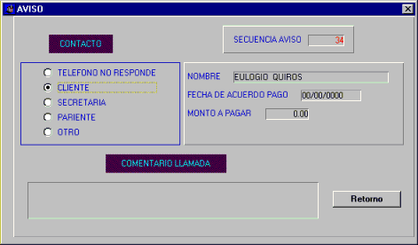 Aviso de Cobro: El gestor de cobro puede generar un aviso de cobro y crear los datos de seguimiento, fecha de compromiso de pago, monto a paga, puede poner un comentario de la llamada.