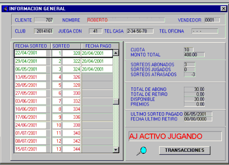 retiros, sorteos jugados, disponible y premio. Se presenta las fecha de pagos de cada sorteo y el número